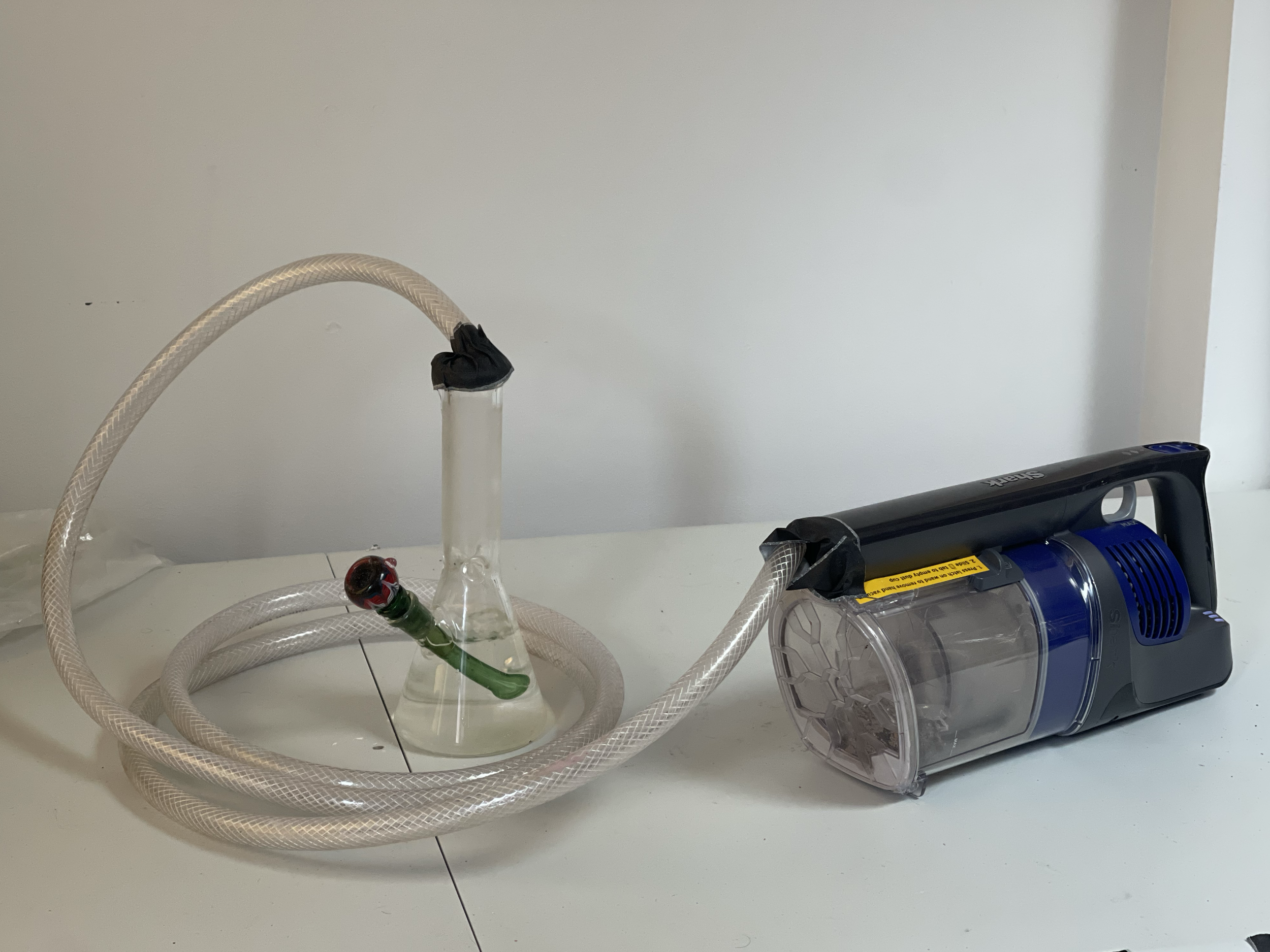 14 inch glass bong connected to a vacuum cleaner that is turned on, sucking air from the bong through clear plastic tubing. Installation variable.